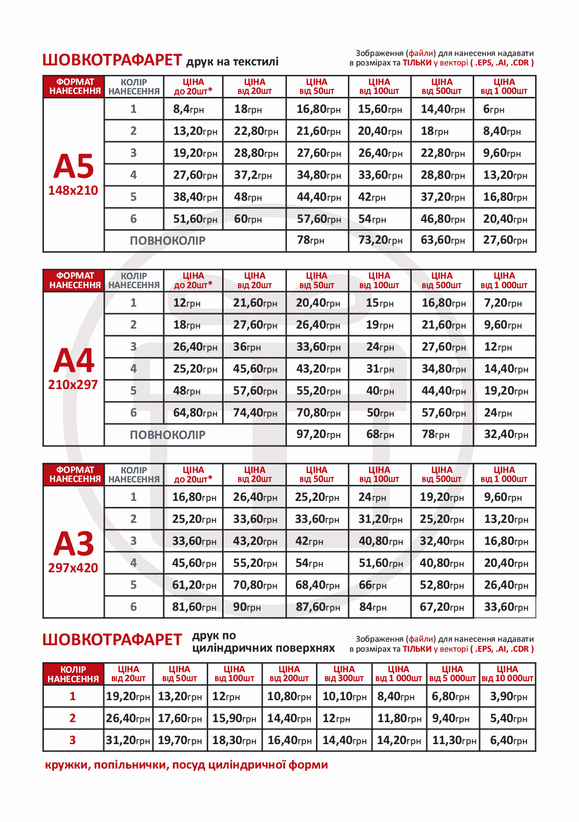 | А3 297 * 420 | 1 | 16,80 грн | 26,40 грн | 25,20 грн | 24 грн | 19,20 грн | 9,60 грн |